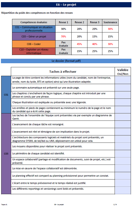 | C01 | La page de titre contient les informations utiles (nom du candidat, nom de l’entreprise, année, nom du lycée, BTS et option) ainsi qu’une illustration adaptée. Le sommaire automatique est présenté sur une seule page. Les entêtes et pieds de pages contiennent au minimum le numéro de la page et le nom du candidat qui a écrit cette page. Les chapitres s’enchaînent de façon logique, chaque chapitre est introduit par une phrase et conclu par une phrase. Chaque illustration est expliquée ou présentée avec une légende. |
